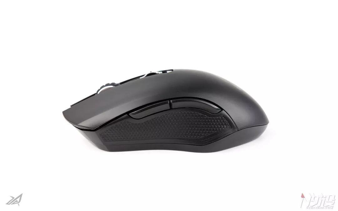 双料(橡胶+塑料)一体成型的防滑胶几乎覆盖了整个侧裙,就是蜂窝纹理过于常见了,没啥特点,不能给鼠标增色添彩,纹理做的漂亮也是能提升产品质感的,这点可向一线大牌多学习,这部分的拼合精度倒是做得不错,反观上盖与底座(尾部),精度或是咬合力度不够的关系而留下了缝隙。侧键的面积不大,细而长,触面做了斜切内凹弧度,下部与侧裙保持于一平面,顶部飞出,有点要勾住拇指的意思。