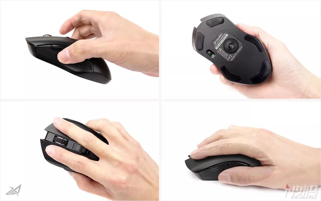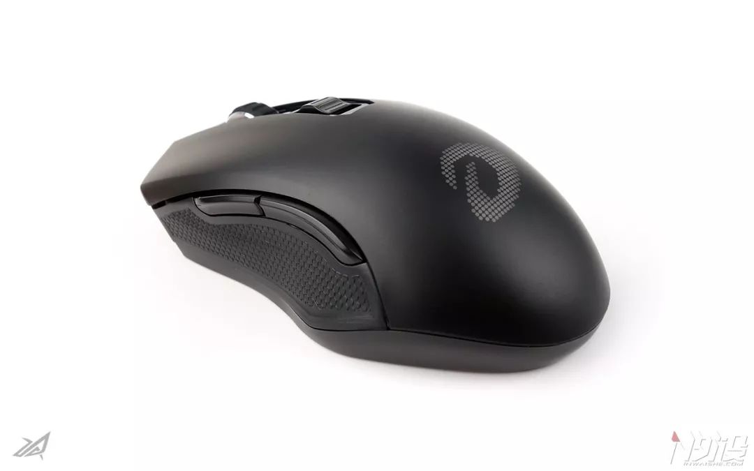 EM905双模版的外观跟有线版保持一致,除去左侧键,机身是完全对称的流线型设计,前端按键板手指附着面积充足,指槽位有微微内凹的人工学曲面,中段两侧大幅度的收腰,增强手指挟持的稳定度,尾部收尖、底座两侧削面,给掌心腾出多一点点的活动空间,鼠标定位还是偏向于灵活操控型的。新版像素风格的达尔优Logo也是明智之举,至少已经没什么寨味了,就是稍微大了点。