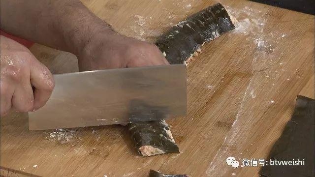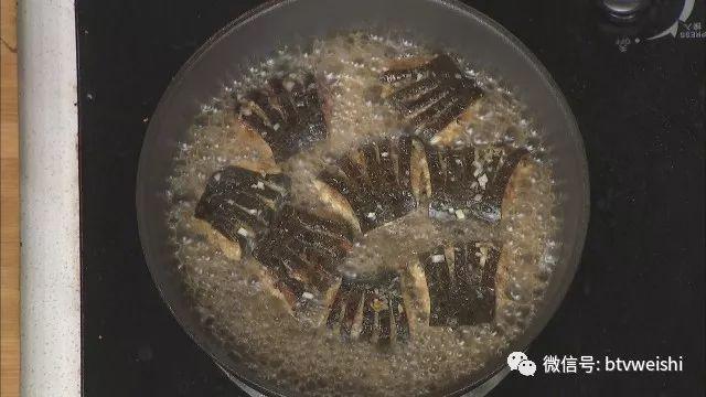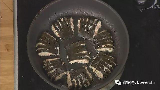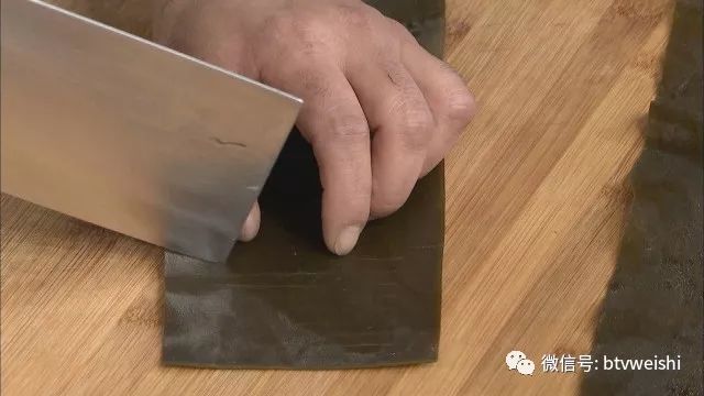 将海带卷每五根“指头”切成一块,2成油温,下锅煎制。