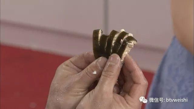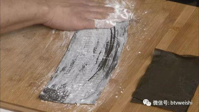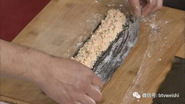 将调好的馅料放到抹过淀粉的海带上,只放整块海带的一半,再用另一半包裹住馅料,轻轻按平。