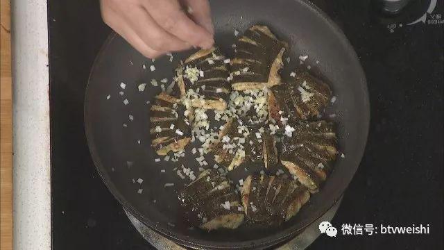 海带煎至两面焦黄,烹入料酒、下入葱姜末,调入酱油和清水烧煮6分钟左右,即可出锅食用。
