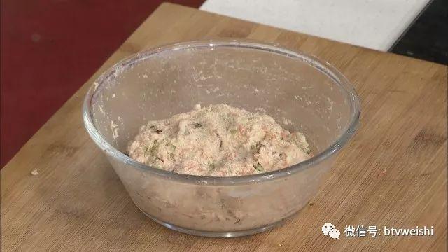 5份的北豆腐和一份的肉馅加葱姜末搅匀,拌入胡萝卜碎、香菇碎和香菜碎,再调入盐和白胡椒粉和匀。