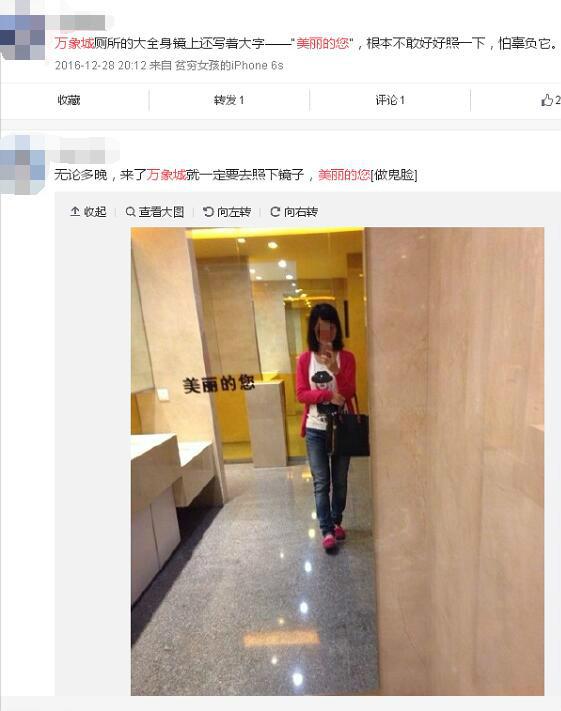 小扶不得她们那么喜欢照镜子,她最讨厌的就是万象城厕所的镜子,照就照嘛,偏偏,上面还写了个:美丽的您。