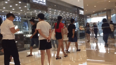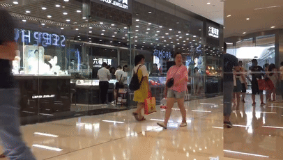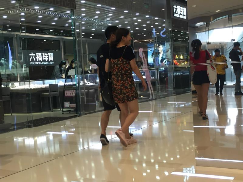 一对中年夫妇从地铁方向往商场里面走,走到周生生门口,大叔斜眼看了一下镜子里的自己,反倒是阿姨没有回头,昂首挺胸地快步往前走。