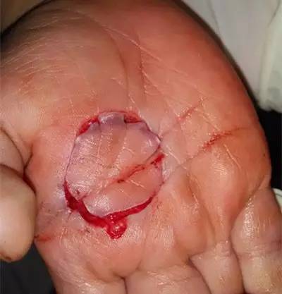 经过:一个2岁宝宝在家玩耍时,用手掌拔扫帚头,手掌搓出了一圈深深的血痕。