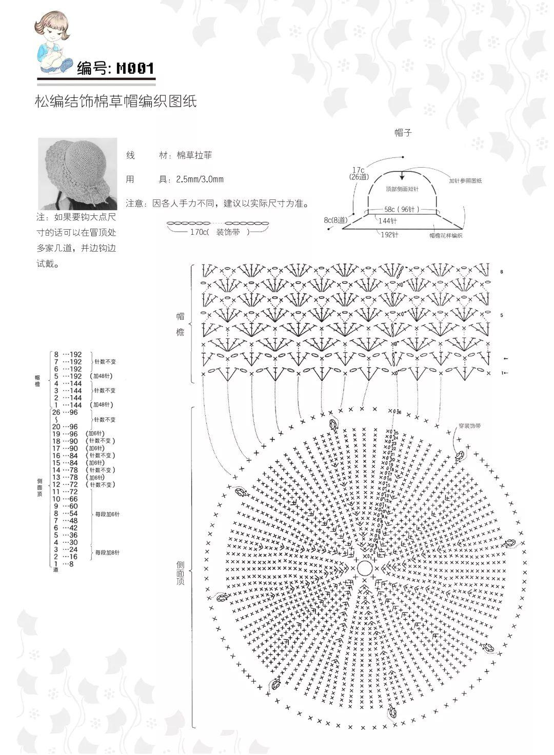先钩帽顶,按图解加针,加到96针后不加针了,一直钩所需的长度,然后钩帽沿还是钩到需要的长度结束。