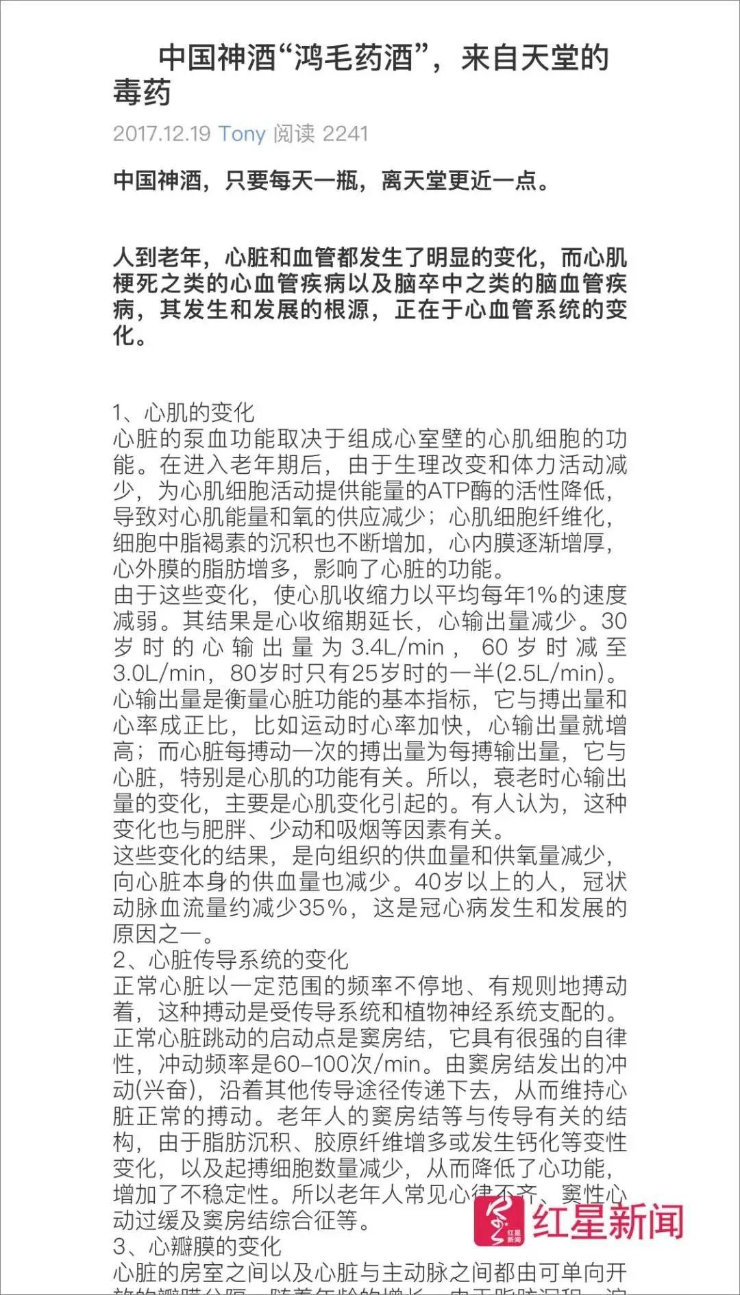 去年12月,拥有麻醉医学硕士学位的医生谭秦东在“美篇”发表了《中国神酒“鸿毛药酒”,来自天堂的毒药》,文章从心肌的变化、血管老化、动脉粥样硬化等方面,想说明鸿茅药酒对老年人会导致伤害。表述本身是有一定科学依据的,但是标题却使用了情绪化的“毒药”一词。今年1月,内蒙古凉城警方以“损害商品声誉罪”抓捕了谭秦东医生。