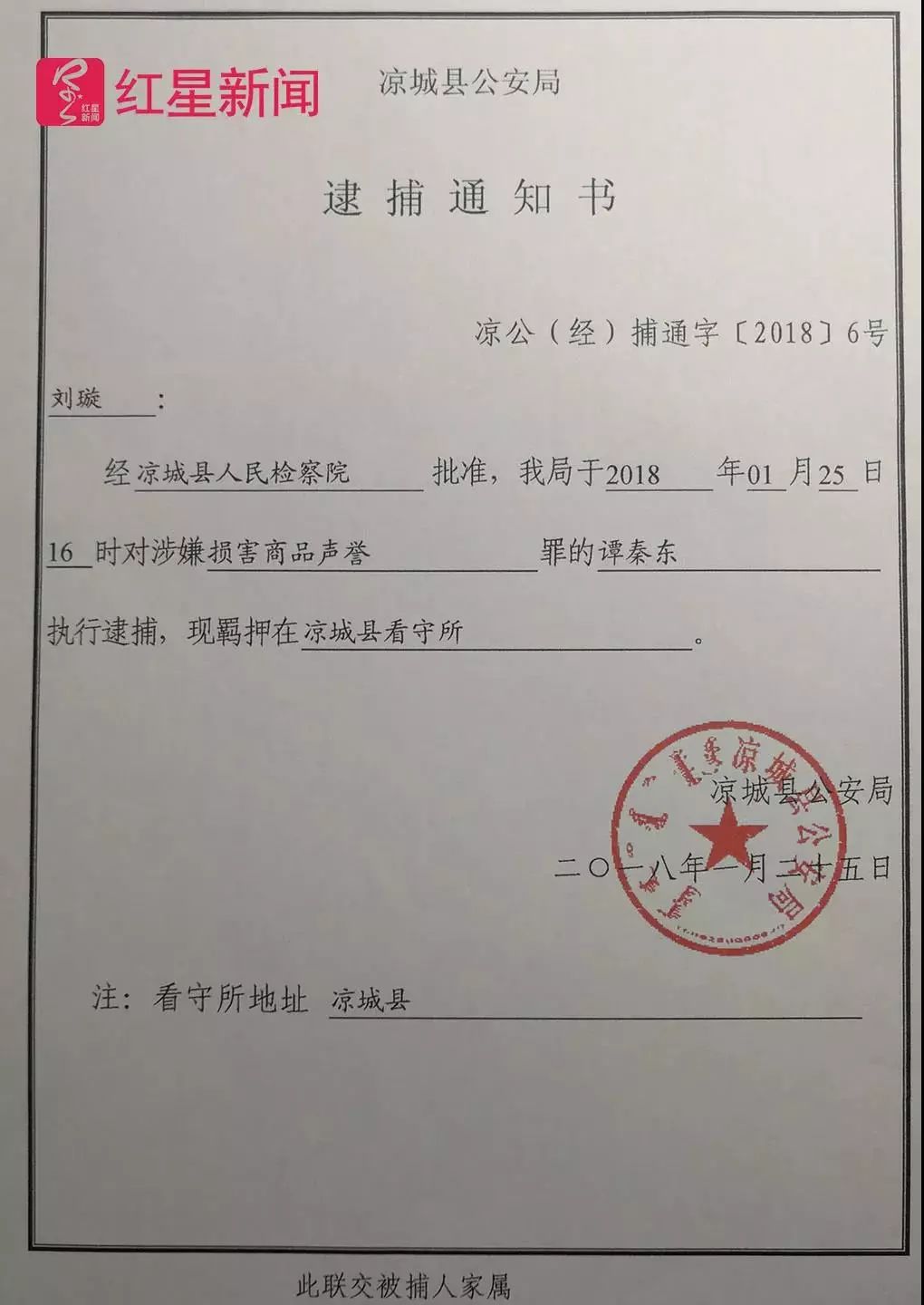谭秦东家属刘璇收到的逮捕通知书