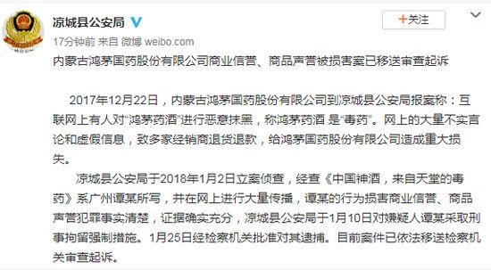 凉城县公安局4月15日通报,内蒙古鸿茅国药股份有限公司商业信誉、商品声誉被损害案已移送检察机关审查起诉。