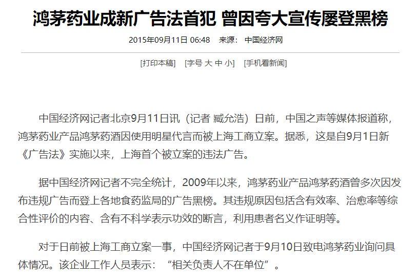 要知道一个事实:在这篇文章之前,鸿茅药酒已经在市场上饱受质疑。有媒体根据近十年的职能部门的公告文件做出不完全统计,鸿茅药酒广告曾被25个省市级食药监部门通报违法,违法次数达2630次,被10省市18次采取暂停销售的行政强制措施。