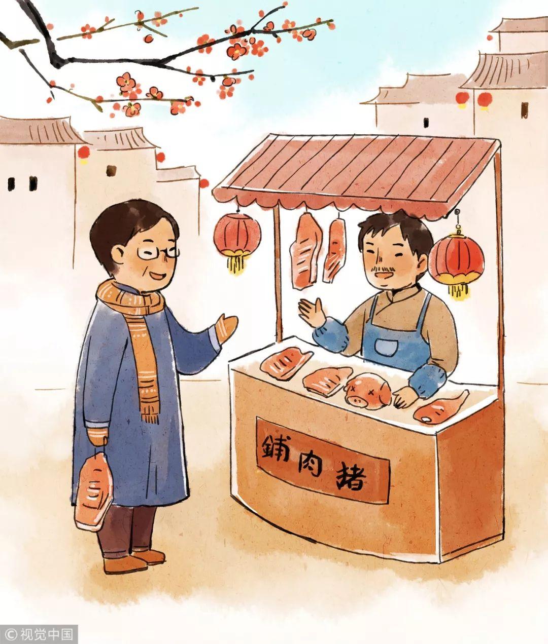 评析:新年传统装扮小姑娘美滋滋的抱着五彩的大公鸡,福字满堂的卖年货的小铺,浓浓的年味儿都在这里。