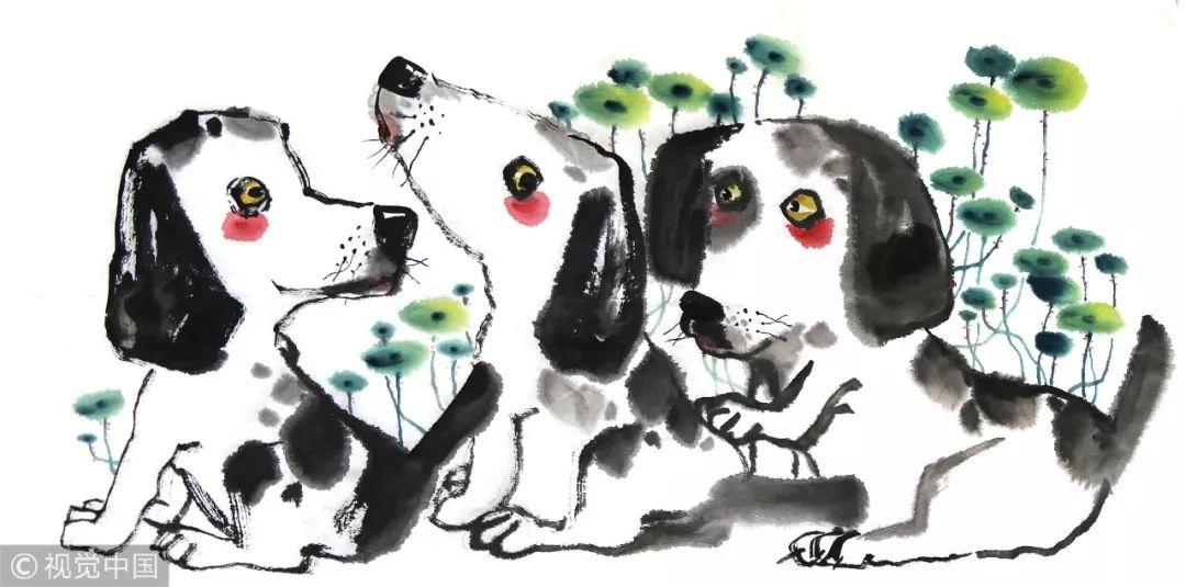 评析:狗年春节的榜单上不乏汪星人们霸屏,而水墨绘制的这组汪星人格外出挑,小狗身上的小斑点,俏皮眼神的小圆眼睛,红红的小圆脸蛋,背景铜钱草的“小圆点”,相映成趣。
