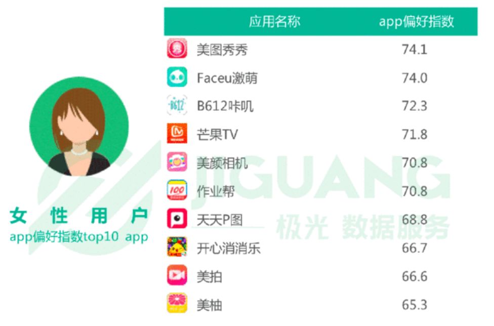 在极光大数据2017年关于手机app数据统计中显示,女性用户最爱用美图秀秀、Faceu激萌和B612咔叽等拍照P图类app。
