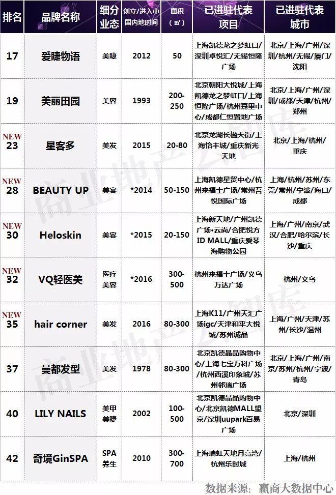 据赢商网统计,2017年购物中心美容护理业态在生活服务业态中占比47.5%,细分业态包括美容、美发、美甲、美睫等。TOP50中,美容护理品牌占10家