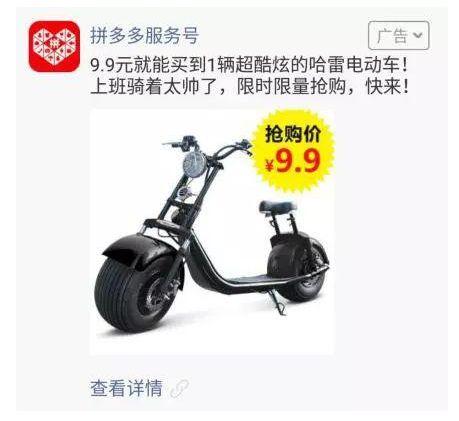 日前,不少网友表示收到来自拼多多关于“9.9元抢购电动车”的广告推送,但点击进去是提示*载下**其平台的APP,*载下**后却无法找到“9.9元抢购电动车”的相关内容。