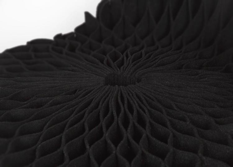 Möbel 椅出自设计师 Tianyi Shi 和 Max Hampton-Fischer 之手。它很轻,不足 9 公斤,由多层再生工业毛毡制成,这些毛毡固定在一起,在展开时形成蜂窝状图案。厚厚的毛毡层保证其坚固耐用,满足一至两个人使用。椅子内有一个金属按扣,用于折叠椅子时使用。