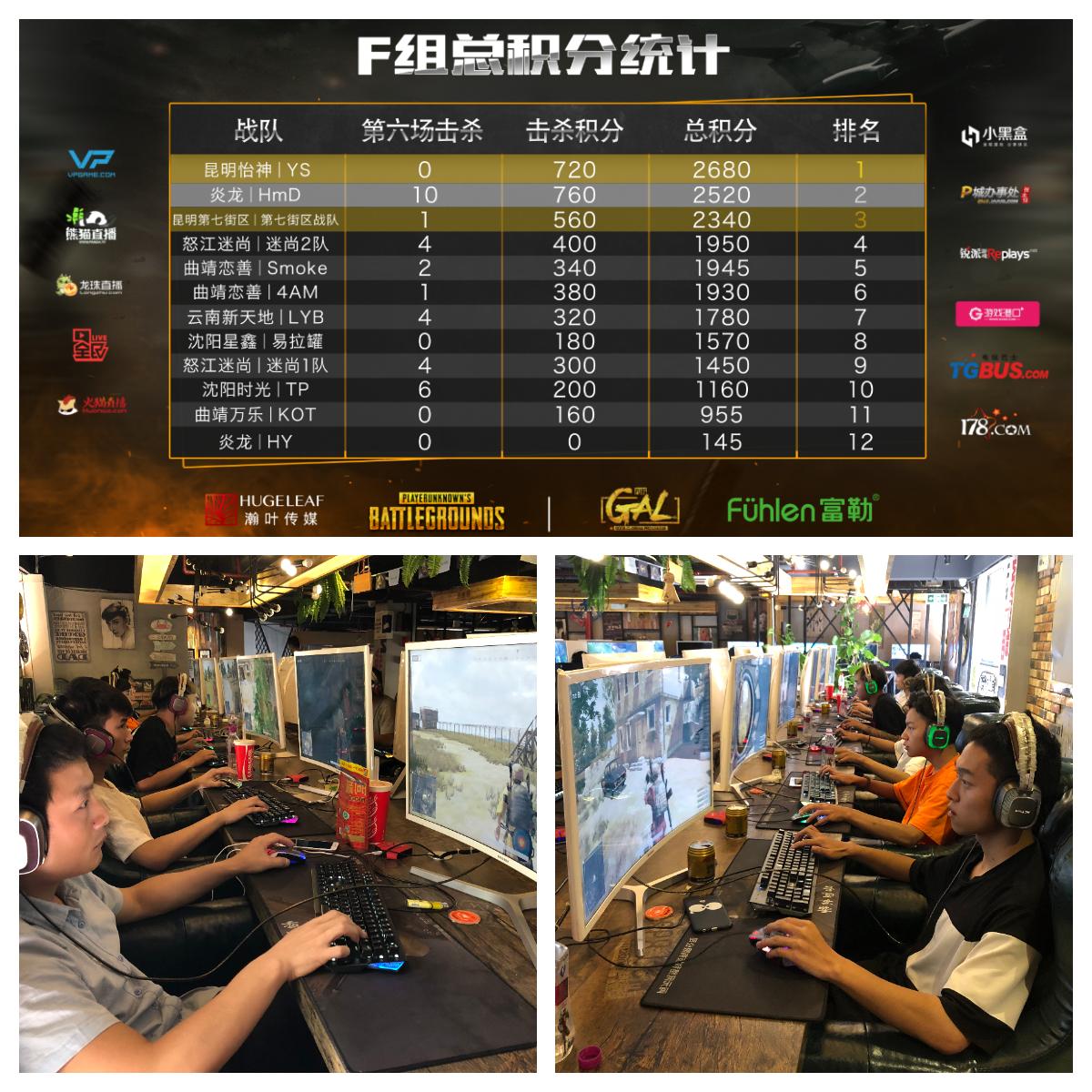 北京时间7月14日中午1点,2018富勒杯GAL PUBG 竞技赛S2区域赛F组的比赛正式打响。本次F组小组赛参与的网吧有来自云南昆明的怡神网吧、第七街区网吧、曲靖恋善网咖、曲靖万乐网吧、新天地网吧、怒江迷尚网吧、沈阳星鑫网吧、时光网吧、昭通博客网吧以及上海炎龙。凭借着两度吃鸡与不俗的击杀成绩,来自昆明怡神网咖的YS战队以2680分名列小组第一。紧随其后的,则是来自炎龙网吧的HmD战队。HmD战队在第一天的比赛中表现抢眼,击杀分更是甩开其他队伍一个档次。但因为没有吃鸡的记录,HmD急需一场胜利。直到F组的最后一场比赛,天命终于眷顾了HmD。最终,他们凭借着2520分以小组赛第二名的资格晋级总决赛。至于F组的最后一个名额,自然是归属同样两次吃鸡的第七街区。不得不说,第七街区的发挥相当稳定。就算在没有吃鸡的几局比赛里,他们也在决赛圈中打出了自己的风采。