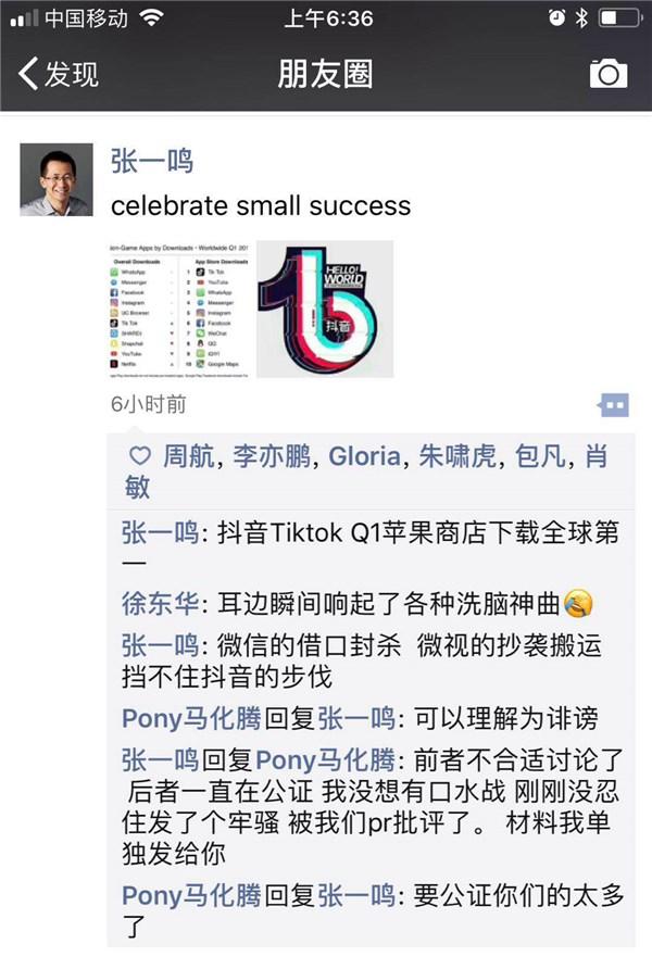 而早些时候,网上流传的一张马化腾与张一鸣互掐的朋友圈截图就揭开了一直以来短视频平台对于微信的借口封杀不满,据了解在今年 3 月底,当时,有很多网友发现,微信朋友圈疑似 屏蔽了抖音短视频内容:将抖音短视频链接朋友圈,只有发布者自己可见,其它人看不到。