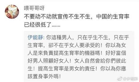 然后,在她的微博下,出现了许多针对这句话的评论,比如“不要动不动就宣传不生,中国的生育率已经很低了”等等,伊能静都一一回复怼了回去。