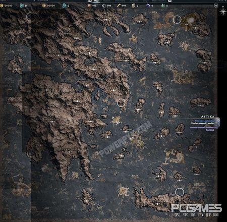 从地图中可以看到有一片主要陆地,其他陆地则是大小形状不一的岛屿。游戏中总共有30多个区域,其名称为Makedonia, Malis, Phokis, Lokris, Boeotia, Megaris, Attika, Korinthia, Achaia, Elis, Arkadia, Argolis, Messenia, Lakonia, Kythera Island, Thera, Messara, Pephka, Anaphi, Nisyros, Kos, Melos, Hydrea, Paros, Naxos, Mykonos, Delos, Seriphos, Keos, Samos, Andros, Chios, Lesbos, Lemnos, Skyros, Euboea,Kephallonia。