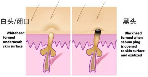 如果油脂冒出毛囊的开口,氧化变黑,就是黑头;如果油脂没有冒出毛囊口,隐藏在深处,就是白头啦。