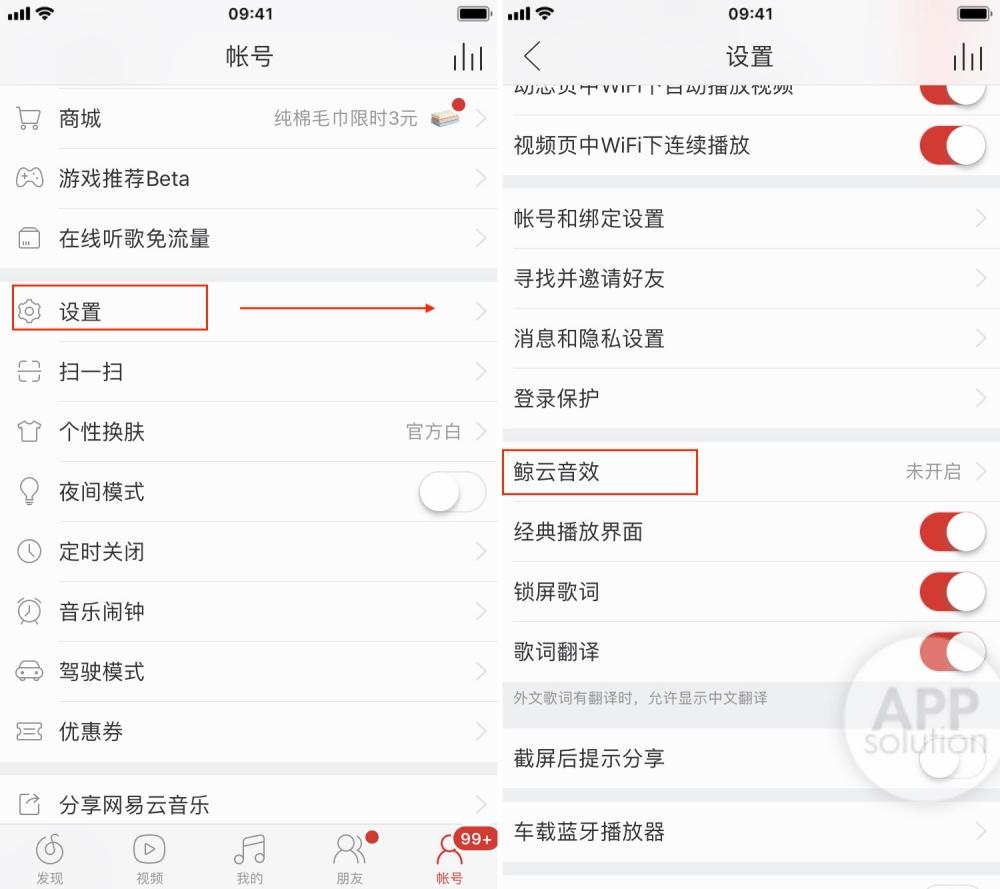 那么问题来了,「鲸云音效」要如何打开呢?首先要保证你的网易云音乐已经更新到了最新的版本。在账号中进入设置选项,就能找到「鲸云音效」的开关了。