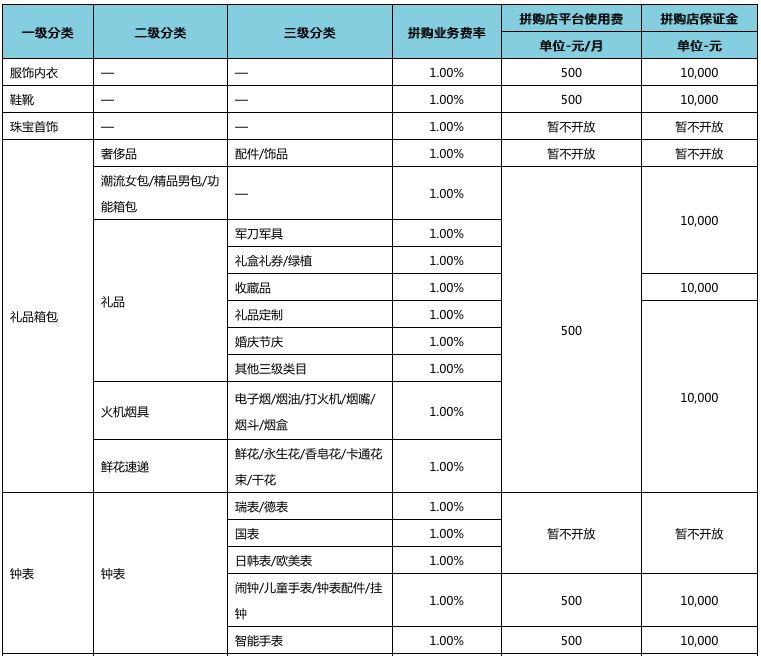 以下是2018年京东开放平台拼购业务资费一览表
