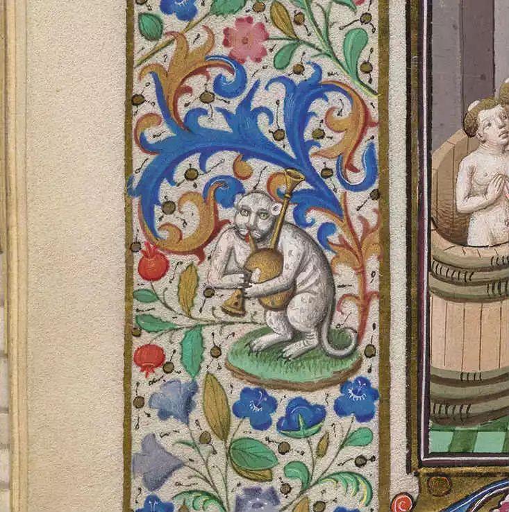 图中的猫在吹风笛,这是大约在1640年巴黎的一本时辰书里的一幅画。也许是邪恶的猫的哭声让这位艺术家想起了管乐的声音。图源:The Pierpont Morgan Library