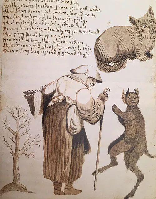 一个寡妇和她的猫以及恶魔。1621年英国北约克郡的女巫案件致使多名女巫和她们的猫被杀死。图源:Courtesy Mary Evans Picture Library