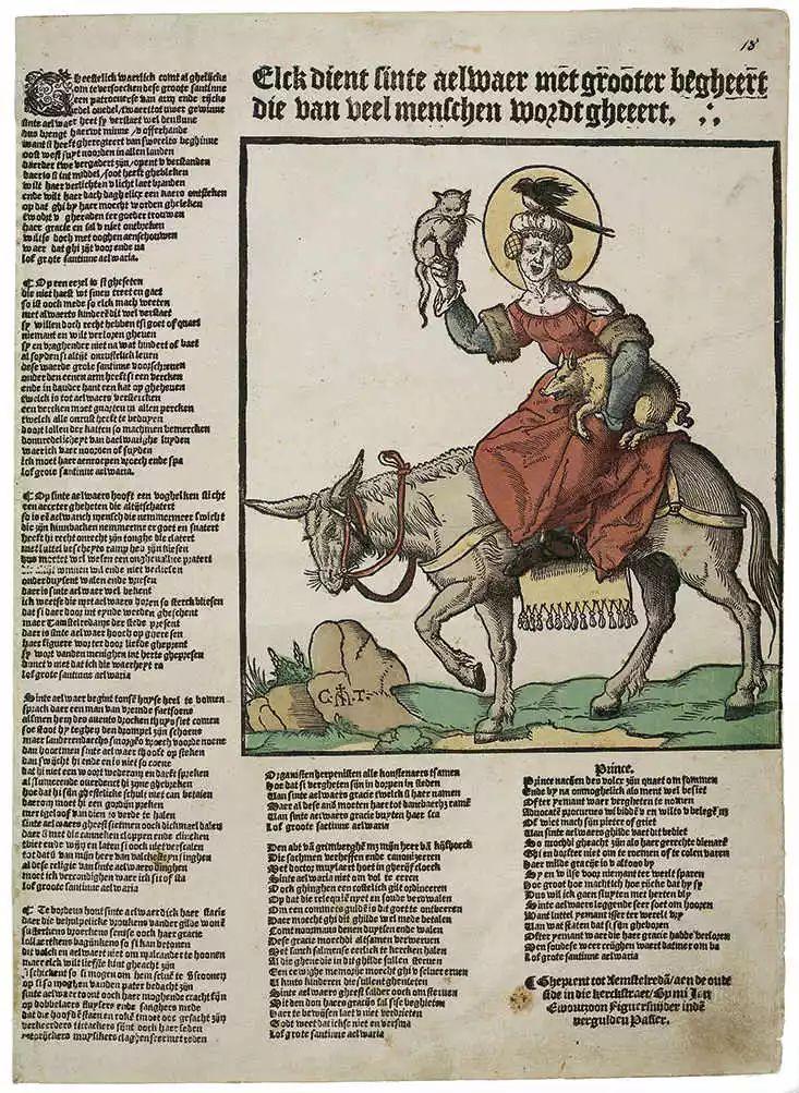 图中与邪恶的猫相伴的恶魔就是反神圣的“圣”埃尔瓦勒(“Saint” Aelwaer),这幅木刻版画来自阿姆斯特丹国家博物馆,时间大约是在1550年,作者是科内利斯·安东尼斯(Cornelis Anthonisz)。