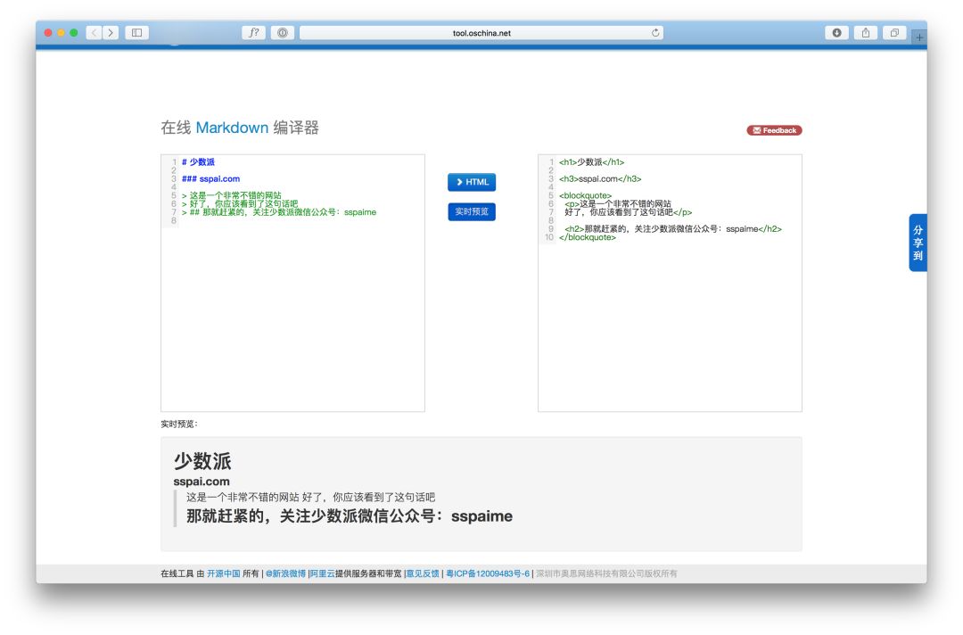 不知道前段时看了 《想学 Markdown?这篇文章帮你快速上手》 之后有没有想尝试一下 Markdown 的冲动,对于还没选择到合适 Markdown 工具的时候,不如先用这款在线 Markdown 编辑器体验一下语法,在这里左侧输入的文本内容都会实时的显示右侧和下侧,分别是 HTML 格式预览以及实时效果预览。但是在网站编辑的内容并没有提供保存到本地的入口,如果你需要请及时复制粘贴。建议只是作为临时备用方案或是体验方案,如需深度体验还是选择专门的 Markdown 工具。