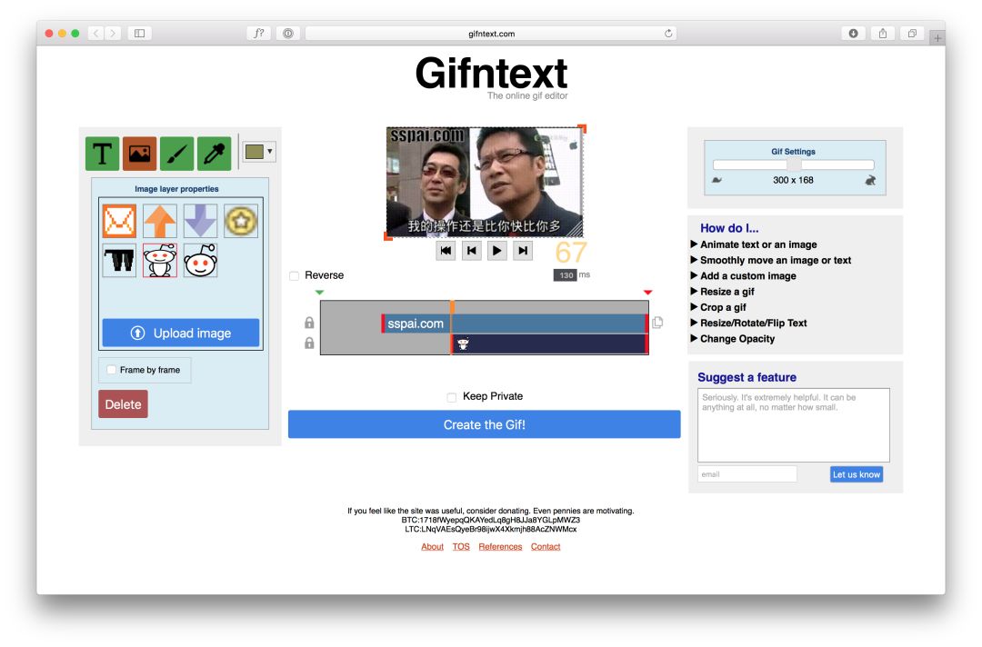 还记得网上很火的「为所欲为」和「王境泽」吧,丰富的表情配上字幕,随随便便就是一个表情包。其实为 Gif 添加字幕也没有那么的困难,只需要将准备好的 Gif 文件上传到 Gifntext 上,然后就可以对*放播**速度以及画面尺寸进行调节。于此同时,也可以自由的在时间轴中加入想要的字幕、图片或是涂鸦。网站最大可以上传 100M 的 Gif 文件,修改完成后创建的动图自动的进行压缩。