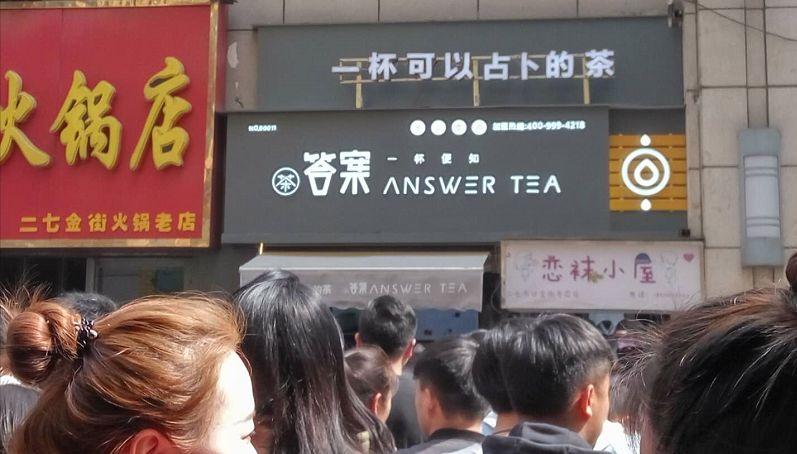不久前,这家叫“答案茶”的奶茶店突然蹿红,据其官方微博显示,从1月14日开业截止3月13日,2个月时间签约了237家加盟商,20多条短视频在抖音获赞 110.5万,近一段时间更是因排长队受到关注。