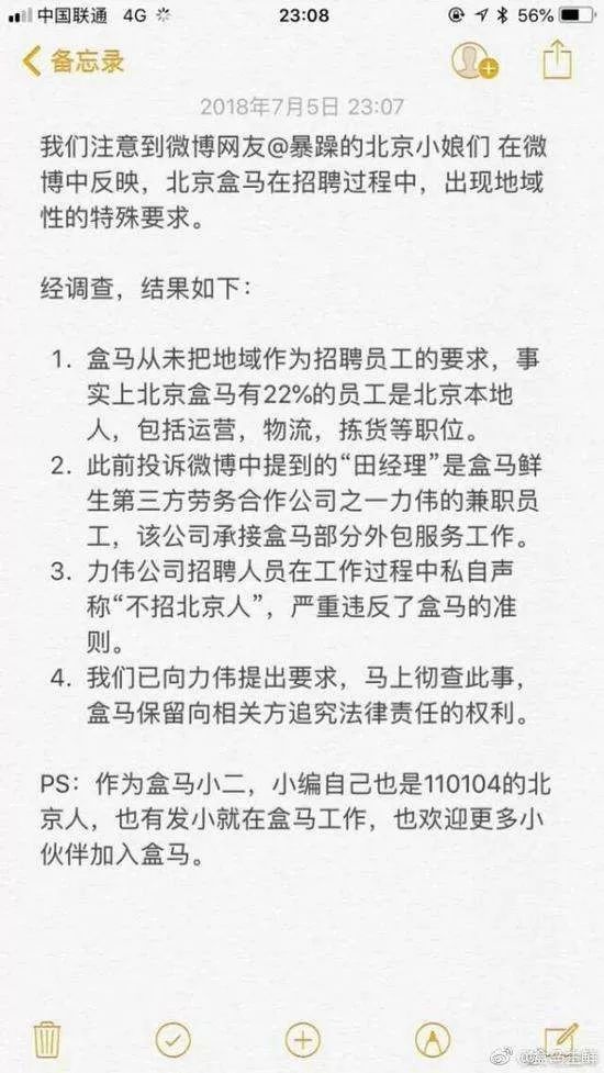 7月6日下午,盒马官方微博再度回应称,为自身低级行为道歉并重申,不可能也确实从未把地域作为招聘员工的要求,但因业务高速的发展,存在管理指导不到位问题。