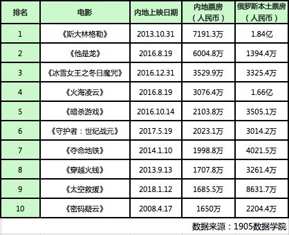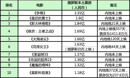 注:由于俄罗斯钱币汇率变动较大,所以影史票房排行采用的版本是以卢布为单位。最后换算成人民币显示。