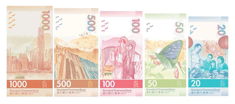 这是三大行首次统一钞票背面的设计主题。新钞系列涉及五个面额,同面额的颜色相同。它们分别描绘了香港的金融中心地位(1000 港元)、世界地质公园(500 港元)、粤剧(100 港元)、在本港栖息的蝴蝶(50 港元)、带有市井味道的早茶文化(20 港元)。“命题作文”之下,不同银行在设计主题的具体呈现上各自有所不同。