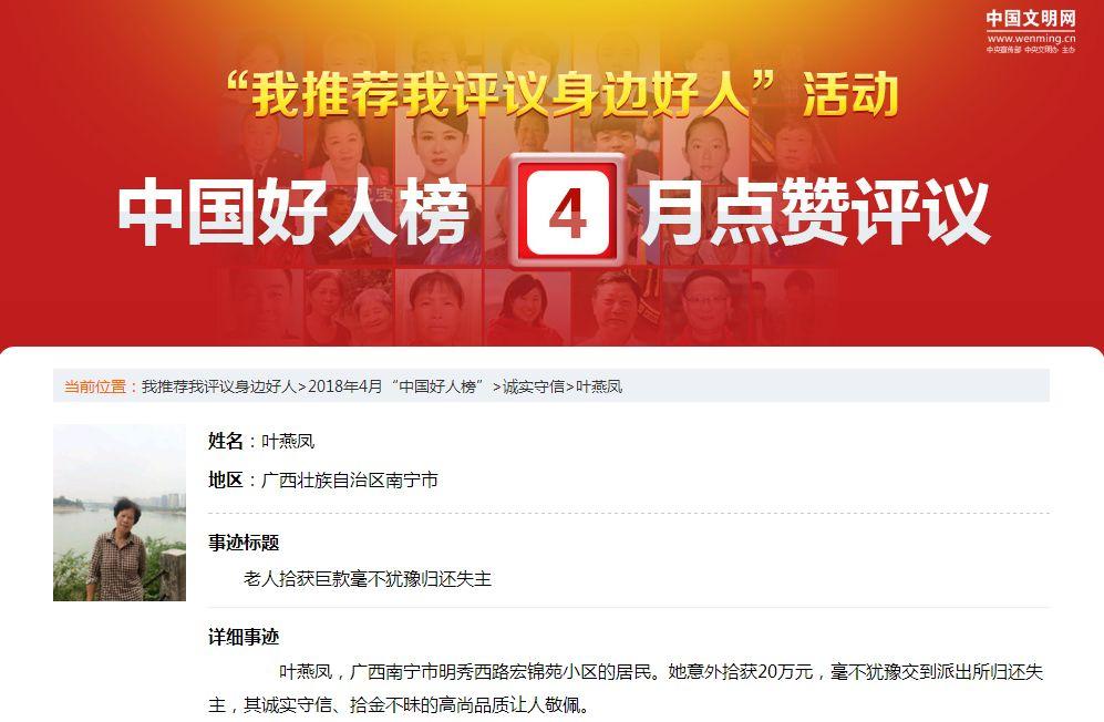 叶燕凤,广西南宁市明秀西路宏锦苑小区的居民。她意外拾获20万元,毫不犹豫交到派出所归还失主,其诚实守信、拾金不昧的高尚品质让人敬佩。
