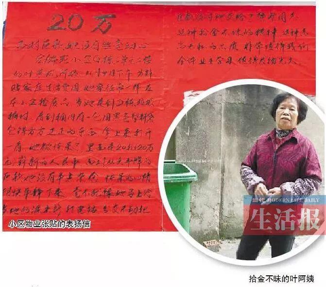 2017年11月4日下午五点多,叶燕凤像平常一样在小区一个垃圾桶里回收废旧物品时,意外发现了一个黑色塑料袋,她打开后发现有个黑包,再打开黑包,竟然发现里面装了一沓一沓的人民币。叶燕凤惊呆了,她不敢相信居然有人把这么多现金给丢垃圾桶了,她以为是*币假**,马上打电话告诉了自己女儿。叶燕凤回忆说:“一万一沓,它用砂纸来包的,十万是一个胶带捆着的,可能是刚从银行取出来的,因为它很平整,机打那种。”叶燕凤当时和女儿数了一下,袋子里面总共有20万现金,这还是她第一次见到这么多的现金。