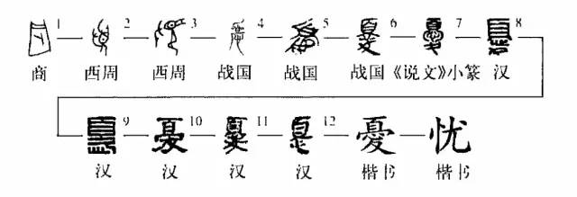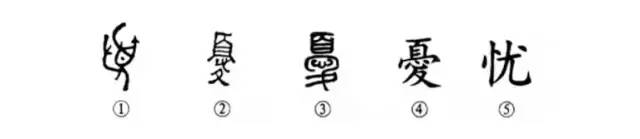 “人无远虑,必有近忧。”这个忧字本为象形字。①是金文的形体,是一个面朝左而站立的人,举手搔头,表示忧愁。②是古玺文的形体。上部为“頁(头)”,中间是“心”,下部有“夂(脚)”,仍表示人的忧愁之意。③是小篆的写法。④为楷书繁体字。⑤为简化字。