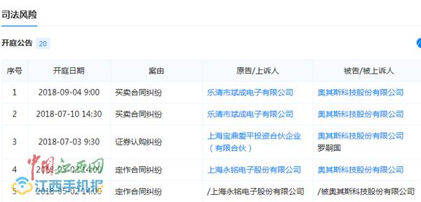 此外,中国江西网财经记者通过天眼查查询发现,截至发稿,奥其斯共有6条未履行法律义务被法院强制执行的案件,在今年6月更是两度被列为失信人名单,而2017年至今共涉及法律诉讼8起。好好的一家明星新三牌挂牌企业,缘何陷入如此窘境?对于此事的进展,中国江西网财经记者仍将继续深追。同时,中国江西网开通新闻热线:0791-86849027,欢迎知情人拨打新闻热线。