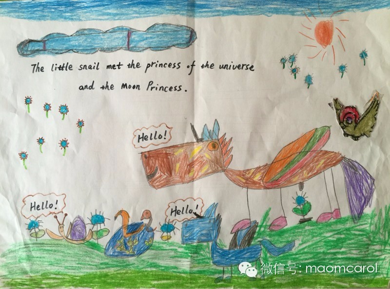 这本绘本能够出炉实在是要非常感谢洋宝的2幅奇思妙想的画和一句话,2幅画就是:蜗牛和天马宇宙公主、鲨鱼火车;一句话就是:我还要画好多蜗牛的画,让蜗牛去旅行。