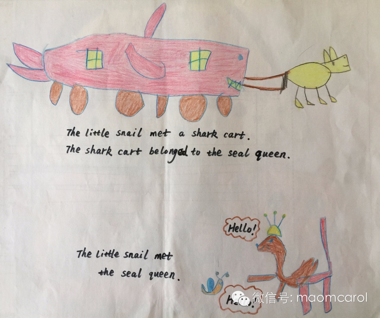 The little snail met the seal queen.The little snail met a shark cart,The shark cart belonged to the seal queen.