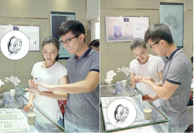 (张效诚与吴敏霞对方试戴婚戒,最终选定黑白钻结婚对戒)