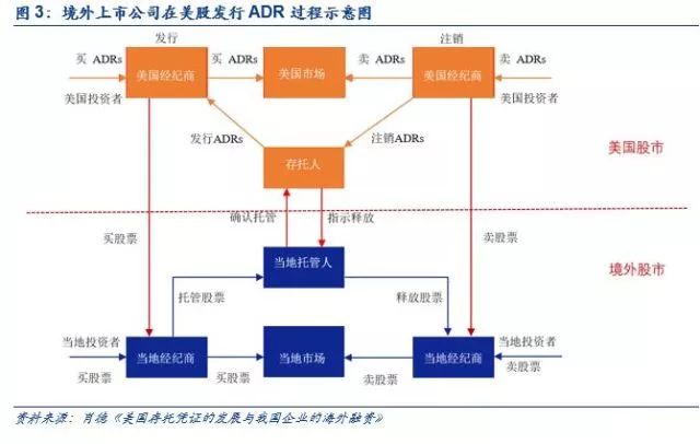 境外上市公司如果在美国股市发行ADR,需要通过当地经纪商买卖股票交由当地托管人,当地托管人再交由美国存托人,美国存托人给美国经纪商发行存托凭证ADR,最后由美国经纪商将存托凭证买卖给美国投资者。这样,就实现了独立市场之间的互通,为海外企业实现了国际资本的接洽。