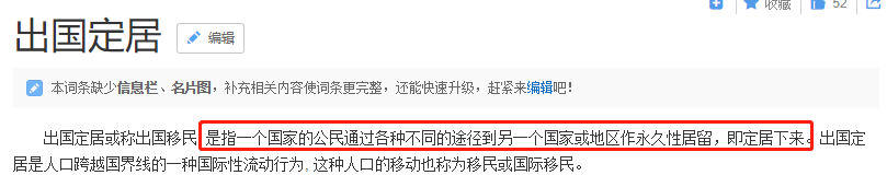此外,百度百科上,对于“出国定居”给出的解释是:“指一个国家的公民通过各种不同的途径到另一个国家或地区作永久性居留,即定居下来。”