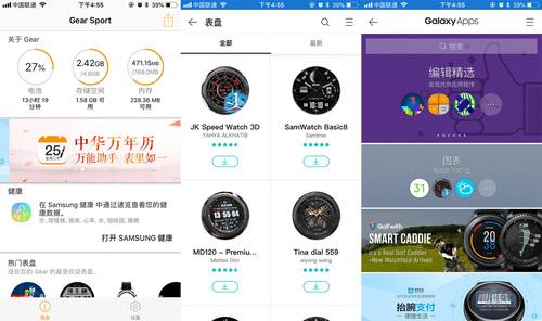 Gear Sport可单独使用,也可通过蓝牙或WLAN与手机连接,安卓与iOS均支持。与手机连接后,可在手机上查看电量、可用存储空间、内存。也可通过手机在Gear Sport上*载下**应用、更换表盘、查找手表。