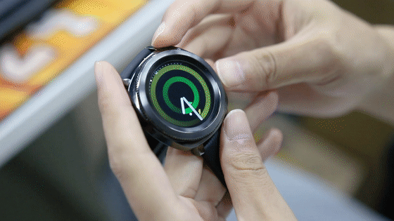 而与手机连接后,另一个方便之处是Gear Sport可以接收手机通知。当有新通知时,会在手表显示屏左边出现一个小黄点,向右滑动屏幕或者逆时针转动表环即可查看。