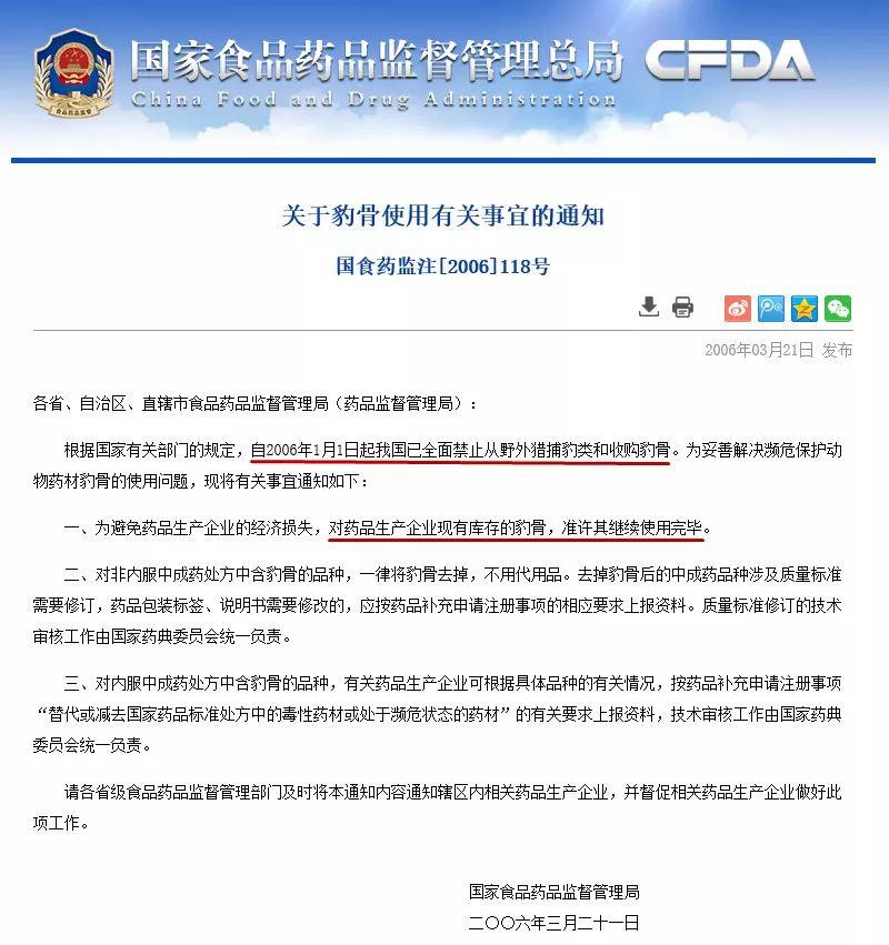 2006年,原国家食药监总局发布的《关于豹骨使用有关事宜的通知》(2006)118号文件,提出“为妥善解决濒危保护动物药材豹骨的使用问题,自2006年1月1日起全面禁止从野外猎捕豹类和收购豹骨”。“2006年的118号文件规定:药品生产企业现有库存的豹骨,准许其继续使用完毕。