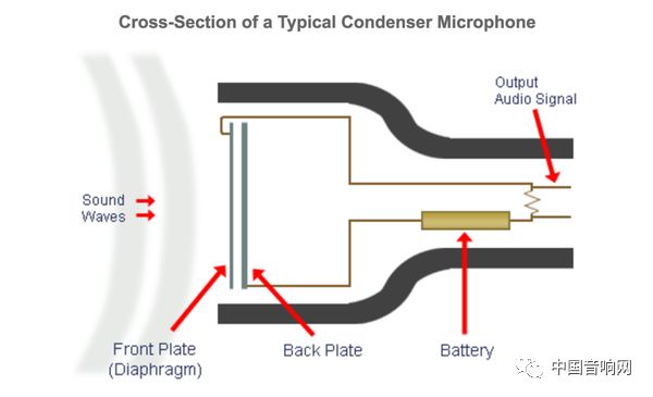 (2) 电容式(condenser或pressuregradient transducer):声音较为细致,反应灵敏,带宽较宽,需要使用电池或phantom power(+20~48V)供电,可以做成极小型的麦克风。