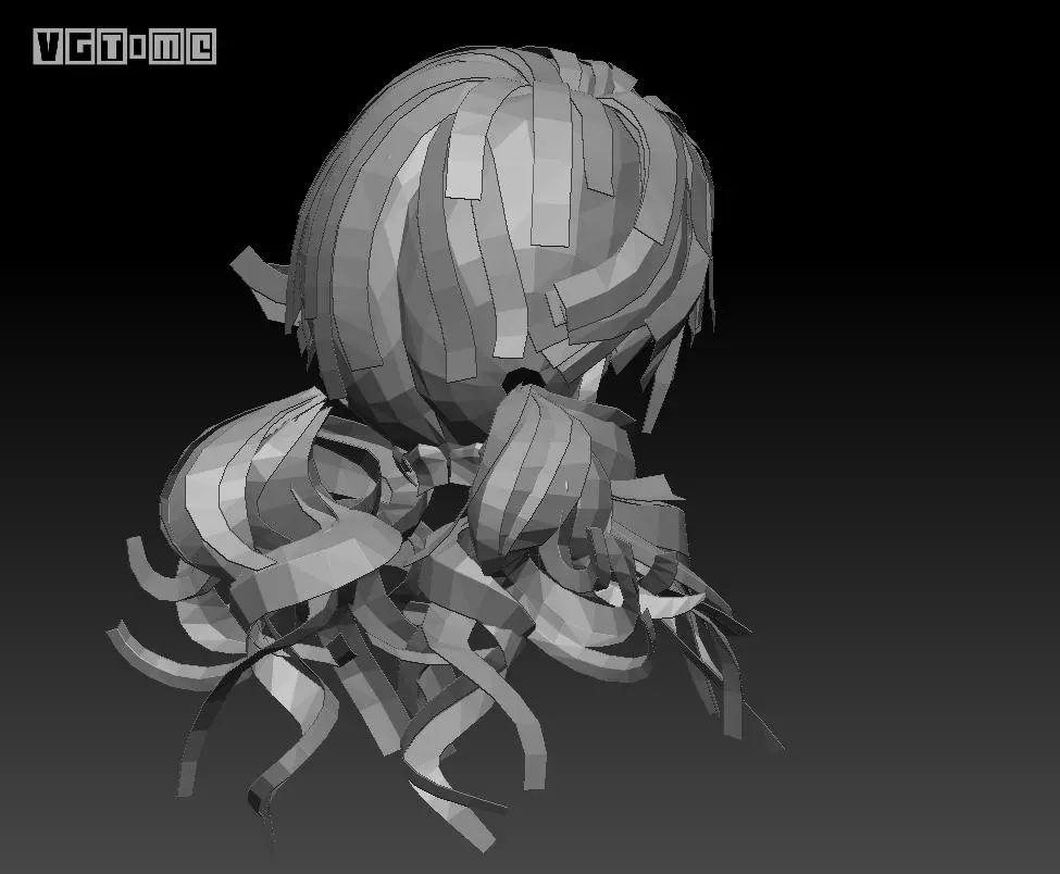游戏里目前通用的毛发做法(如下图),插片配合透明通道加贴图表现。只能以编组的方式,用平面表现立体,其实是一个视觉上的欺骗。当然理论上可以每根头发都用一条面片,但是这样的面数没有硬件能带得动。